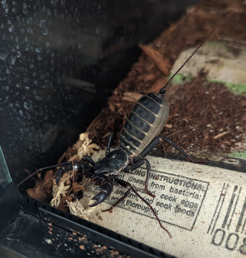 Clyde the Giant Whip Scorpion/Vinegaroon was picked up in 2022 from the same expo as Penne and Kahless. Like Smudge, she likes to burrow around her enclosure and is in a bioactive substrate. She is quick to investigate any changes to her enclosure and is a fearsome hunter of mealworms/darkling beetles. Clyde is pretty territorial of her home, so is not very handleable and will make an impressive threat display as soon as anyone enters her tank.