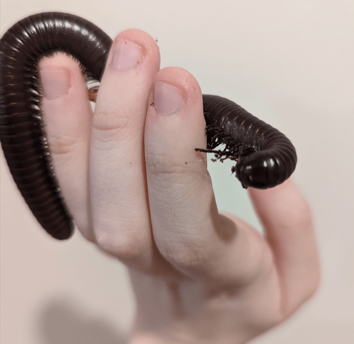 We have three chocolate millipedes, two males and a female, set up in a bioactive enclosure. While they do also spend a majority of their time burrowing, they do regularly come up to the surface to search for food and explore. They are also much more handleable than many smaller species. While they can and will release toxins when they feel threatened, it is not very potent and as they become more used to handling they are less prone to release it. Some of them also seem to enjoy being handled, voluntarily crawling onto offered hands and sometimes refusing to let go.