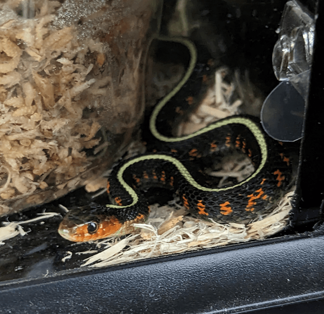 Kahless is our most social/friendly snake, he loves being handled and climbing in people’s clothes. Picked up at the Fall 2022 Tinley Park Reptile Expo at three months old. Since then, this little red-sided garter snake has been a reliable eater and continues to grow both in size and personality. He is a very curious snake who loves exploring new things and climbing. With this curiosity comes cleverness. This trouble maker has figured out how to open several past enclosures, but luckily comes back when he gets hungry.