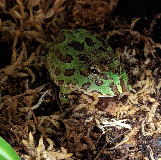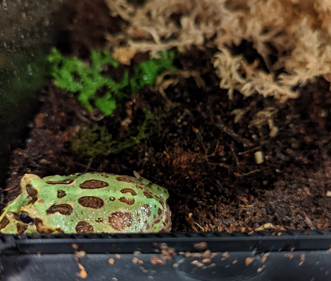 Smudge came from Josh’s Frogs in 2022 and seems to have settled into his new home well. He is set up in a bioactive enclosure with lots of substrate to burrow around in. Like many frogs Smudge’s belly is bigger than his brain and he will attempt to consume anything he sees, hand and food alike.