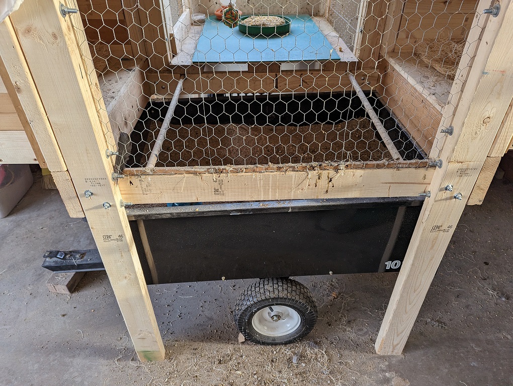Revelation #3: The vertical section of the coop would benefit from another access door for cleaning and maintenance purposes. I originally envisioned accessing the coop interior by removing the cart and ducking under the walls to stand within the vertical coop interior. From this position I would be able to access and clean all the interior surfaces. I saw no flaws in this vision until after the chickens started pooping everywhere. After that, the thought of standing up in that confined poop splashed cage seemed pretty gross. I am considering adding a new access door this Spring.