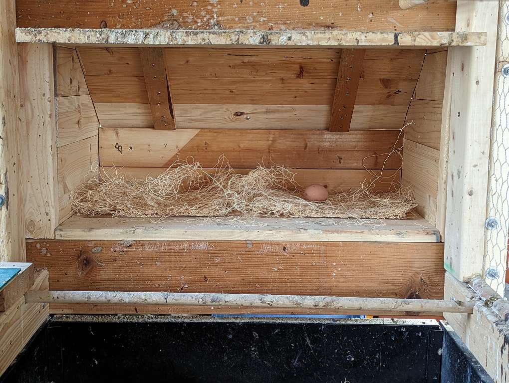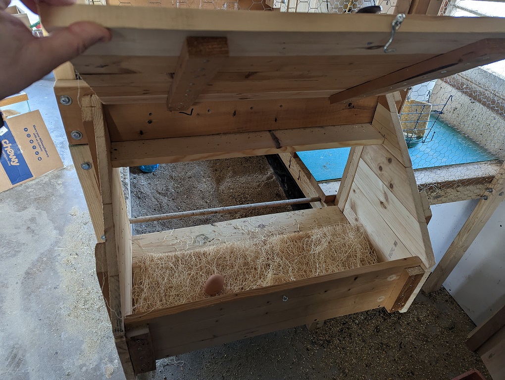 Revelation #4: The nest boxes could use a lip to help hold the bedding in place. In December one of the chickens, Roty (bottom of the pecking order) started laying eggs. The other chickens, for whatever reason, shred the nesting mats and kick them out into the sand cart. Once in January poor Roty laid her egg on the matting in the sand. One of the chickens had jumped on the egg and broken it. Luckily, the broken egg was discovered before the chickens realized its contents could be eaten. I have heard that once chickens recognize that they can consume the contents of eggs they will intentionally break them open for a snack.