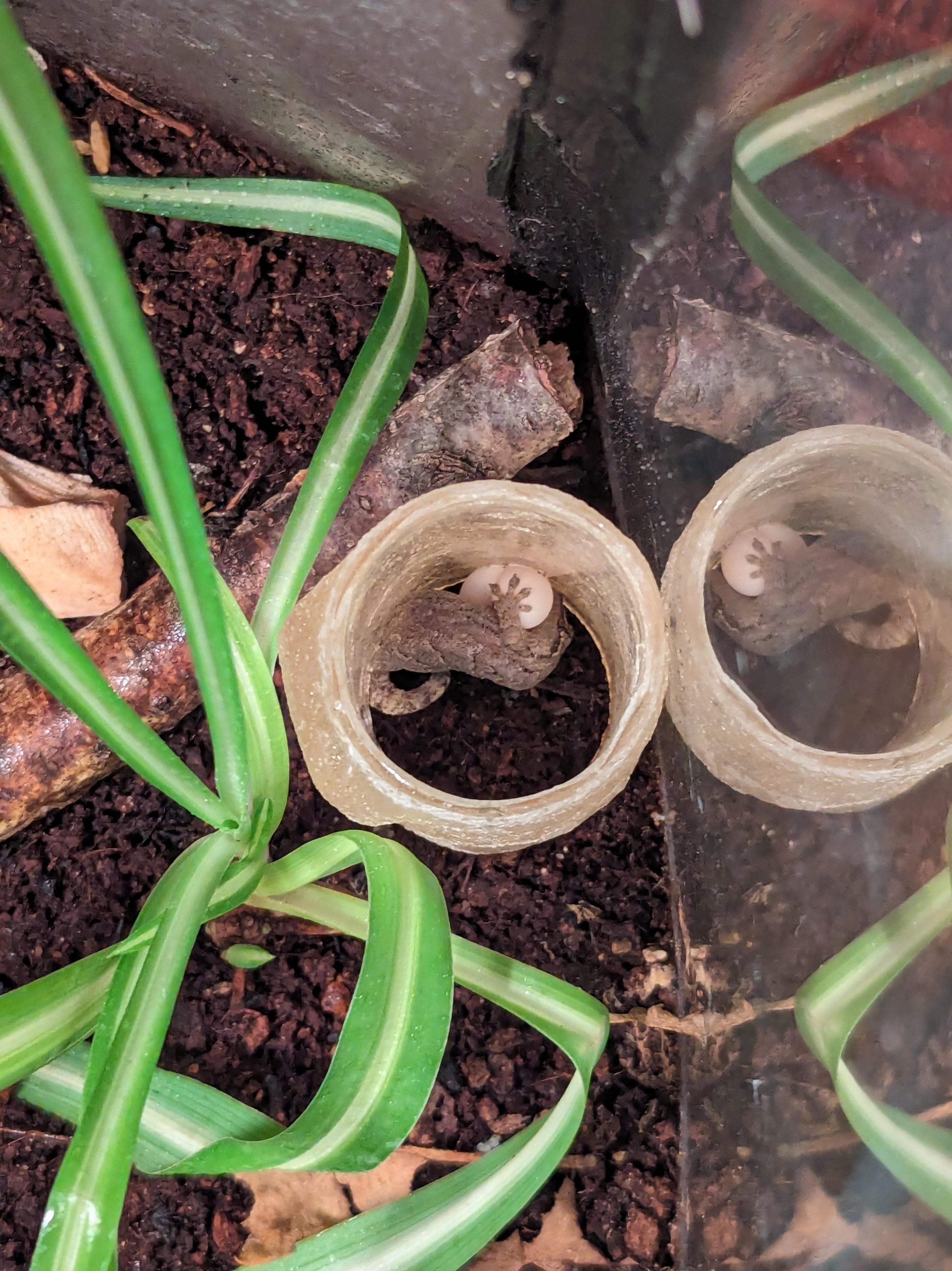 In terms of tank decorations/fixtures/accessories/etc. it is important to consider that they are a shy, arboreal species. They need places to hide and places to climb. They can climb practically anything, but tend to feel more secure if there is a rougher texture. As far as hide are concerned, they just have to be big enough for the gecko to safely fit. They will squeeze themselves into the gaps between sticks or rocks so make sure everything in the enclosure is stable and will not crush them. Plants, such as Bromeliads, Tillandsia xerographica, and ponytail palms can serve both functions. One thing to be aware of with plants is that the mourning geckos will lay eggs in/on the leaves so be careful when moving them.