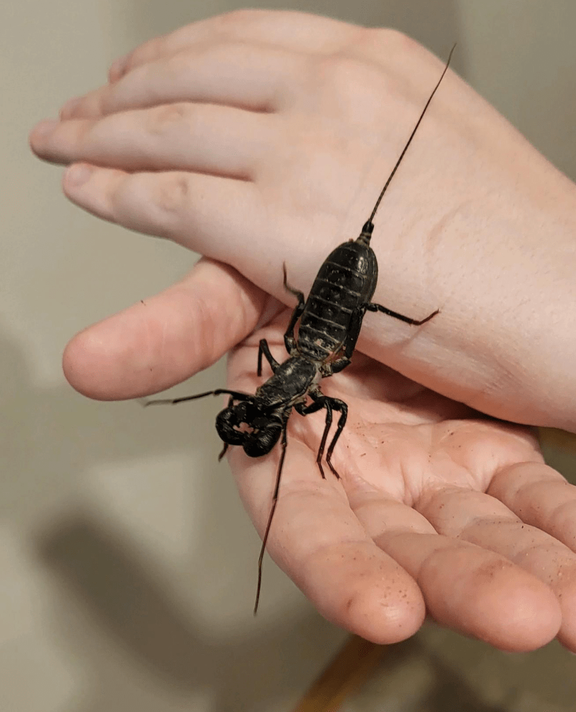 Vinegaroon in the colloquial term for whip scorpions. Unlike the scorpions that most people are familiar with, whip scorpions do not have stingers or venom. Instead they have an antennae-like tail that they use to feel their surroundings and the ability to spray acetic acid (vinegar) from the base of their tail when threatened. This acid is mostly harmless but has a strong smell and could sting if it got into someone’s eyes or a cut.